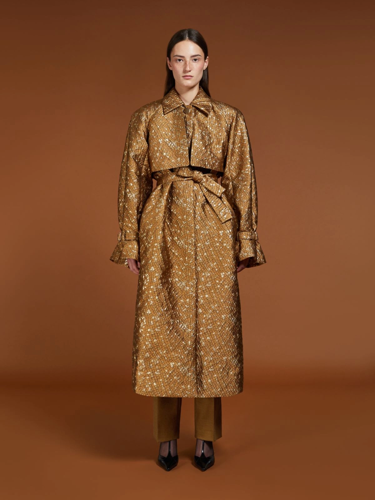 Long, oversized trench coat made of luxurious gold-coloured jacquard fabric. The mosaic-effect texture creates a rich, dimensional play of light with a strong visual impact. The style features a shirt collar, raglan sleeves with adjustable toggles, a wide yoke at the back and front flaps. The silhouette is defined by the matching belt to tie at the waist. Lined in black cupro, it is finished with welt pockets and heritage horn buttons with a visible first gold metal button. The limited edition comes complete with a customised garment carrier and coat hanger.
