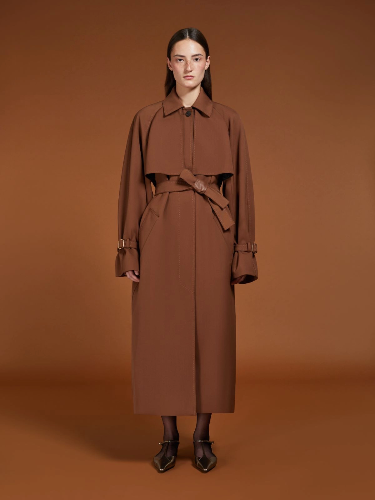 Long oversized trench coat in a water-repellent bonded wool-blend gabardine that is compact with a shiny look. The coat has a contrasting design with a tan exterior and black interior. The construction features a wide back yoke, front flaps and a deep central reverse pleat at the back, fastened with a toggle. Semi-lined in black cupro, it includes raglan sleeves with toggles and welt pockets on the sides. Finished with leather details, an undercollar with M-stitching and a tailored pick stitch. Closure with heritage-inspired metal and horn buttons and a matching fabric and leather belt to define the silhouette. The limited edition comes complete with a customised garment carrier and coat hanger.