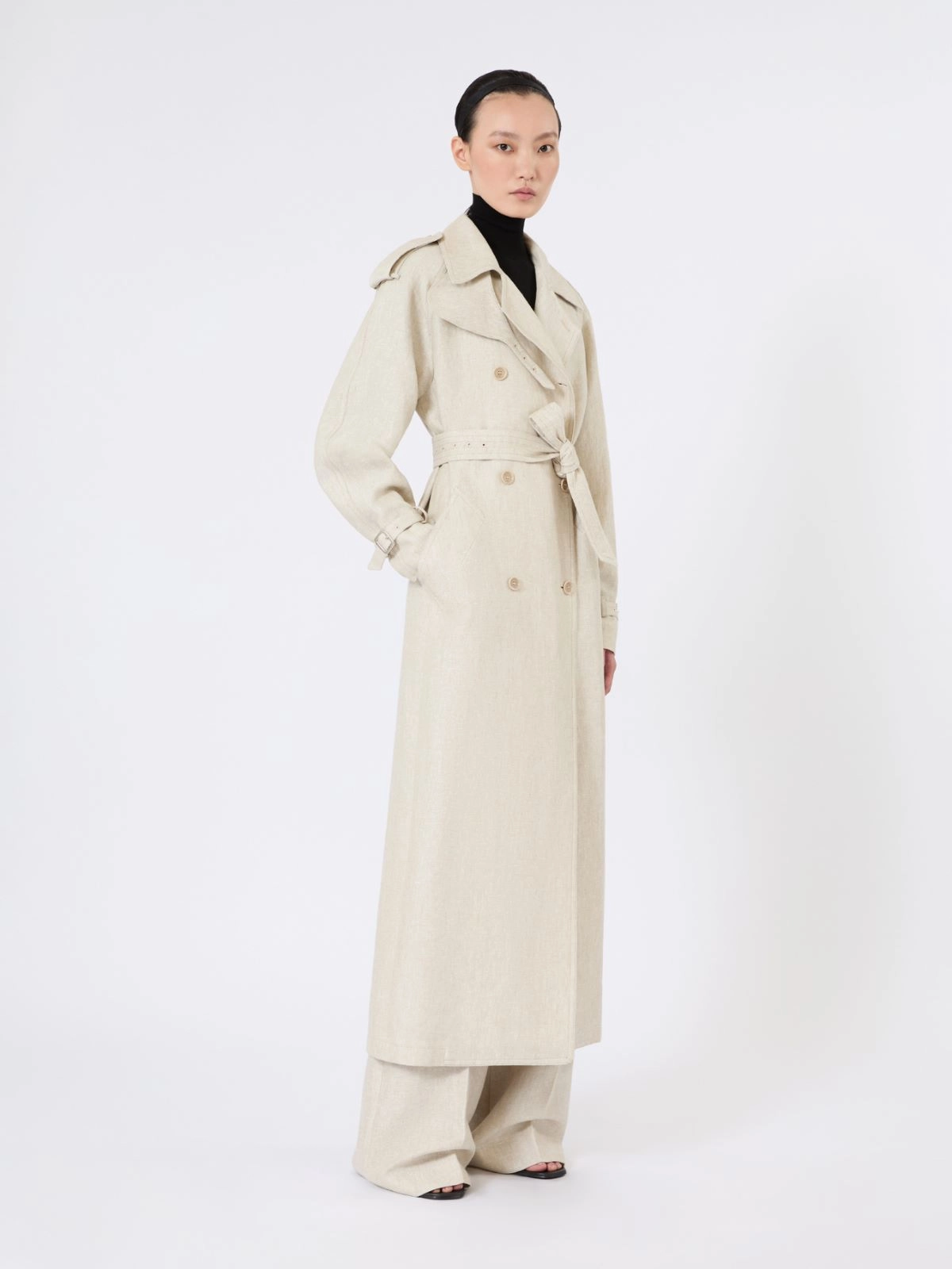 Long double-breasted duster coat, finished with iconic details and a matching belt with buckle and embroidered eyelets that accentuates the silhouette.