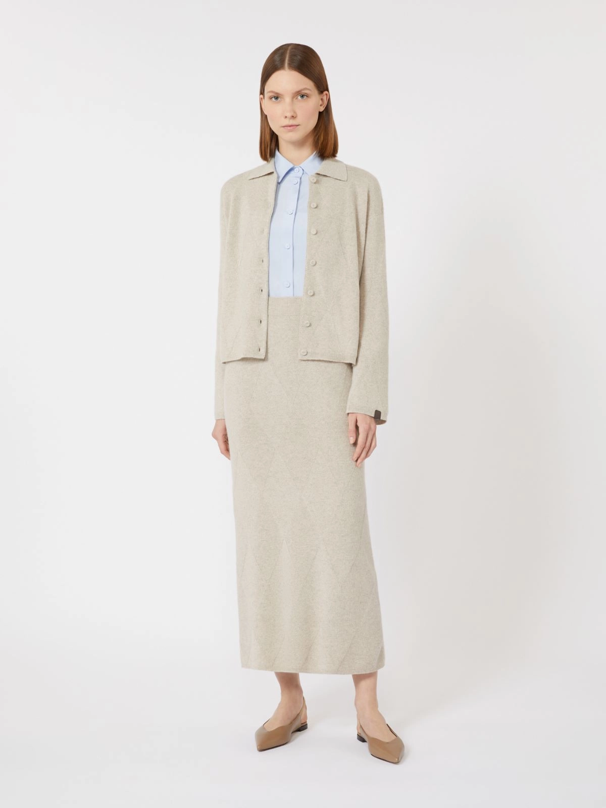 Long pencil skirt in a fisherman’s rib knit finished with an Argyle motif.
