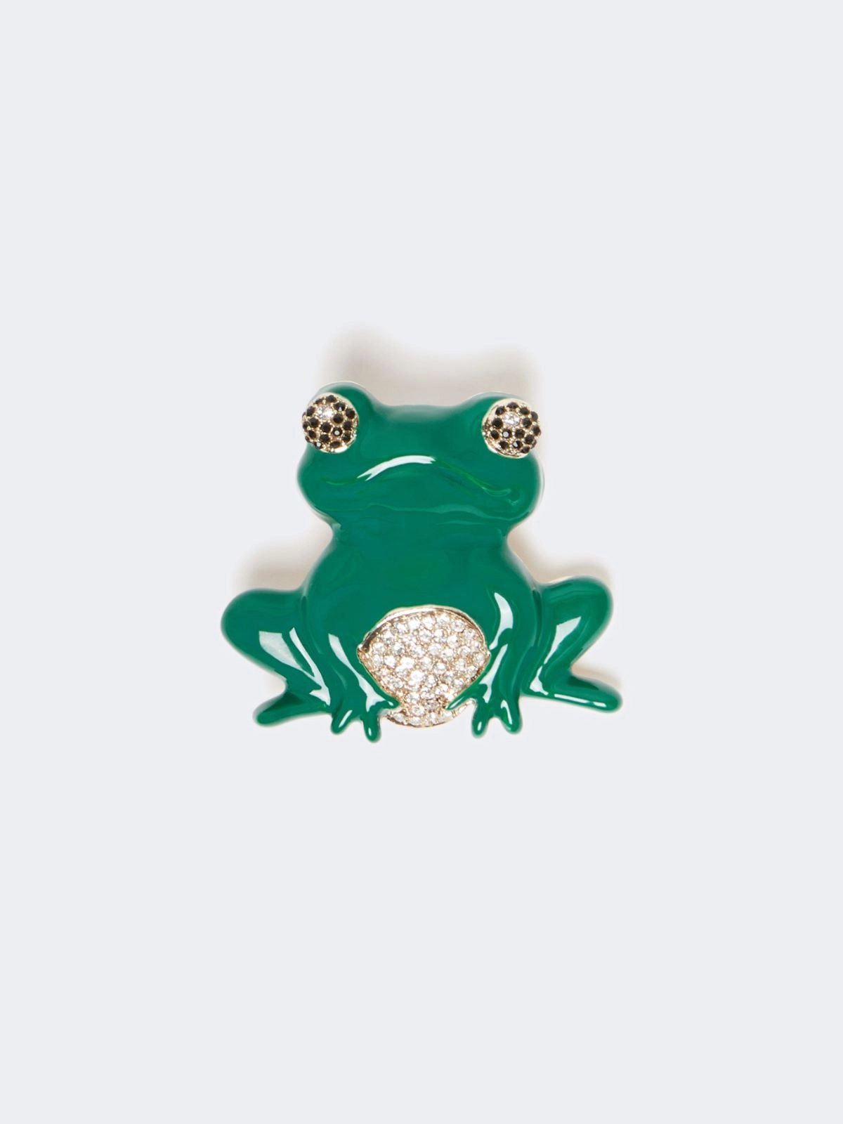 Shaped brooch finished with enamel and rhinestone details.