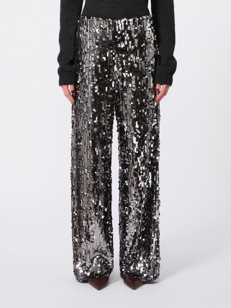 Trousers with a loose silhouette, embellished with an all-over embroidery featuring sequins of different sizes, creating a play of movement and mirror reflections.