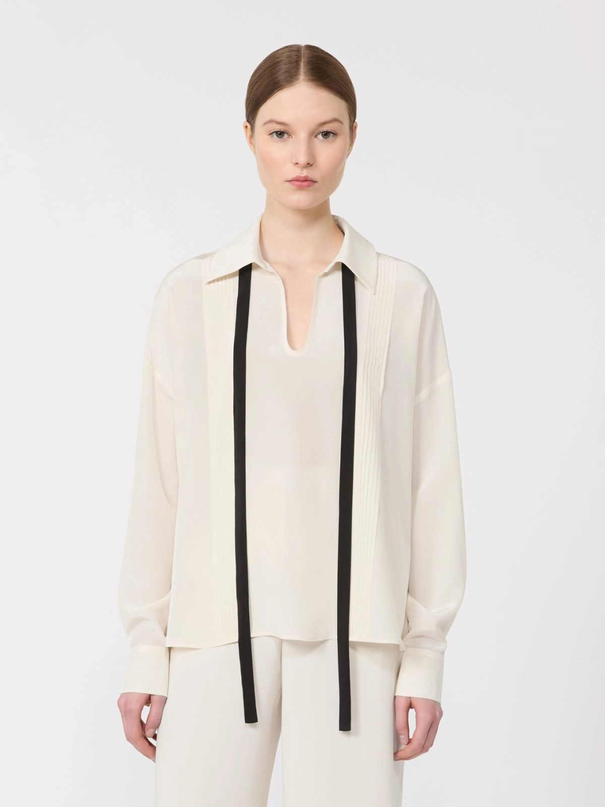 Feminine blouse with contrasting bow-tie, which can either be tied in a bow or left long as a feature.