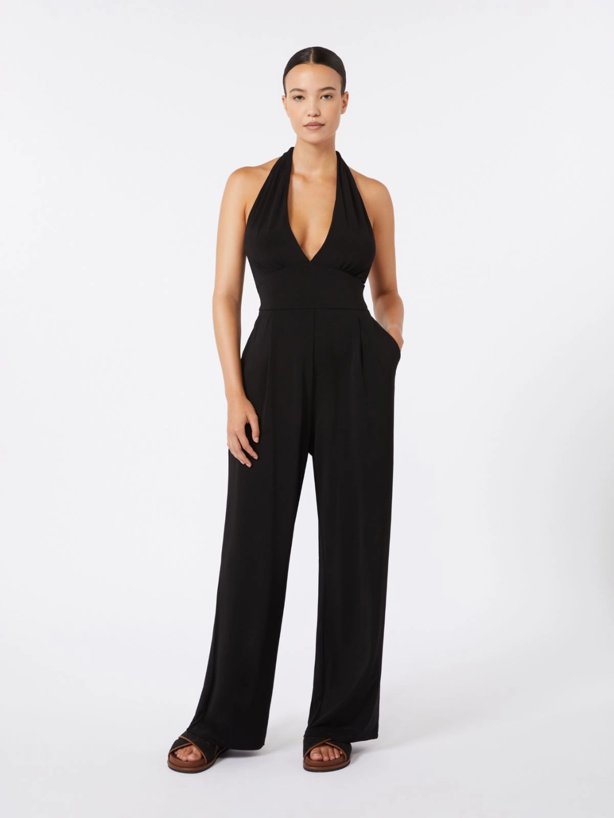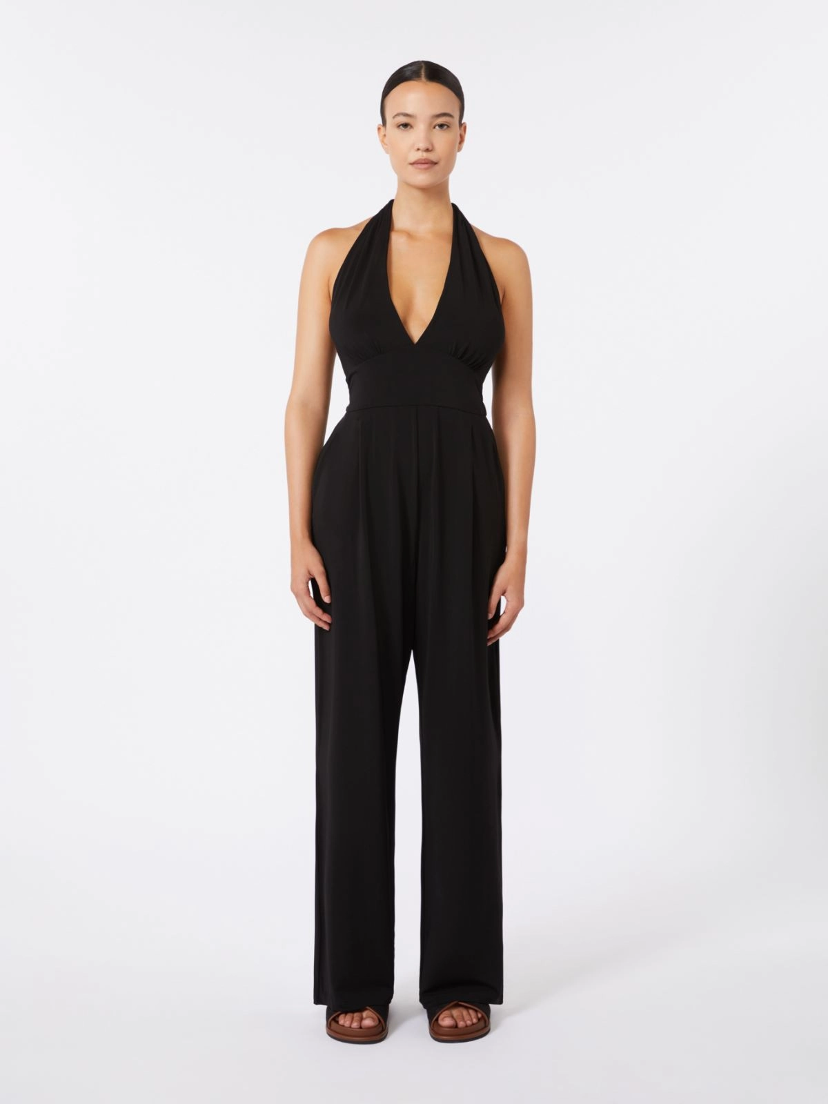 Sleeveless jumpsuit with deep V neck and draped pattern that frames the décolleté.