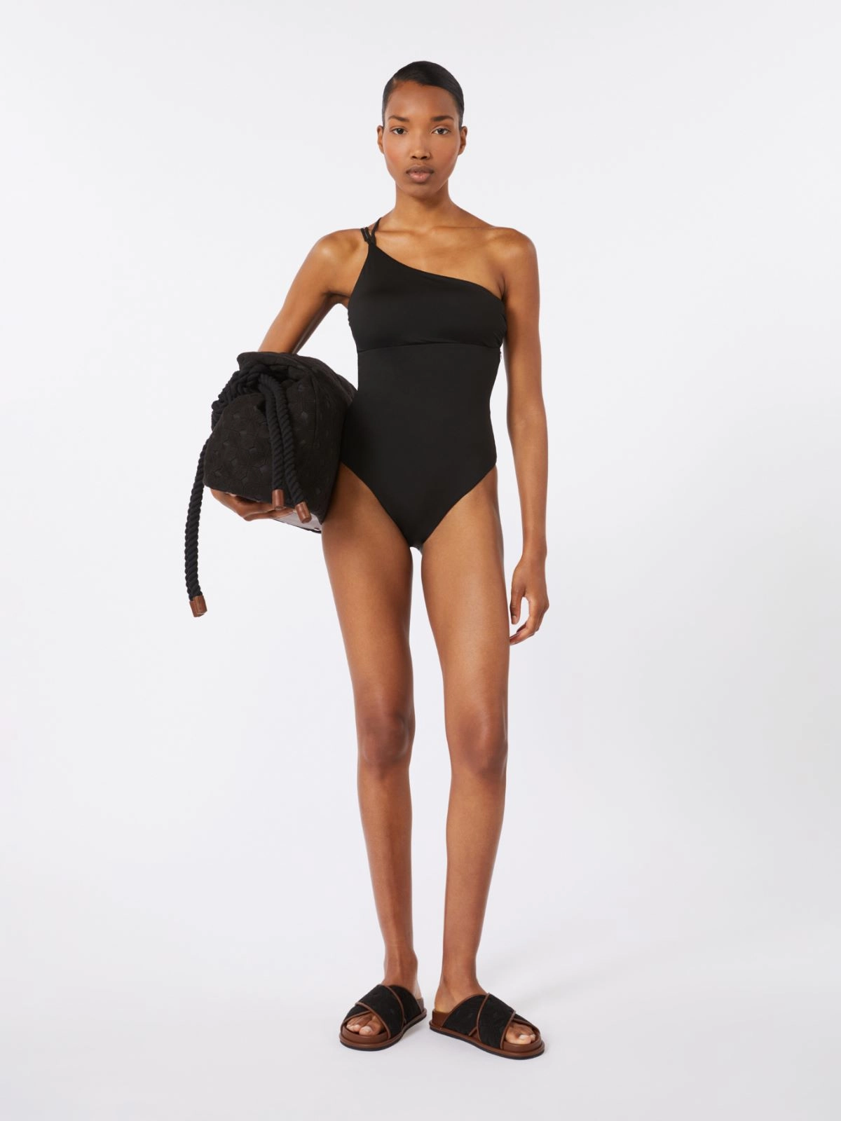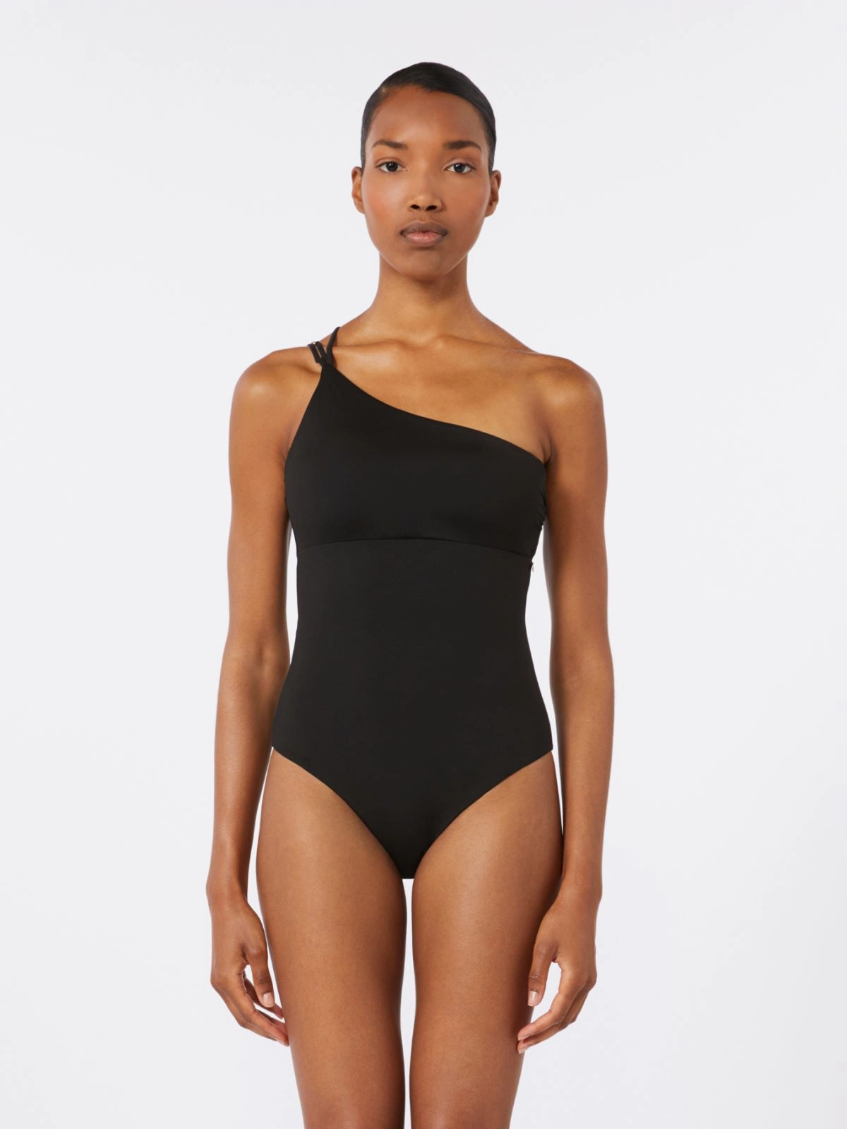 One-shoulder one-piece swimsuit with double shoulder strap detail: a jersey strap, and a chain-look strap with alternating jersey and metal oval elements. The moisture-wicking, quick-dry, UPF 50+ stretch fabric provides all-over comfort.