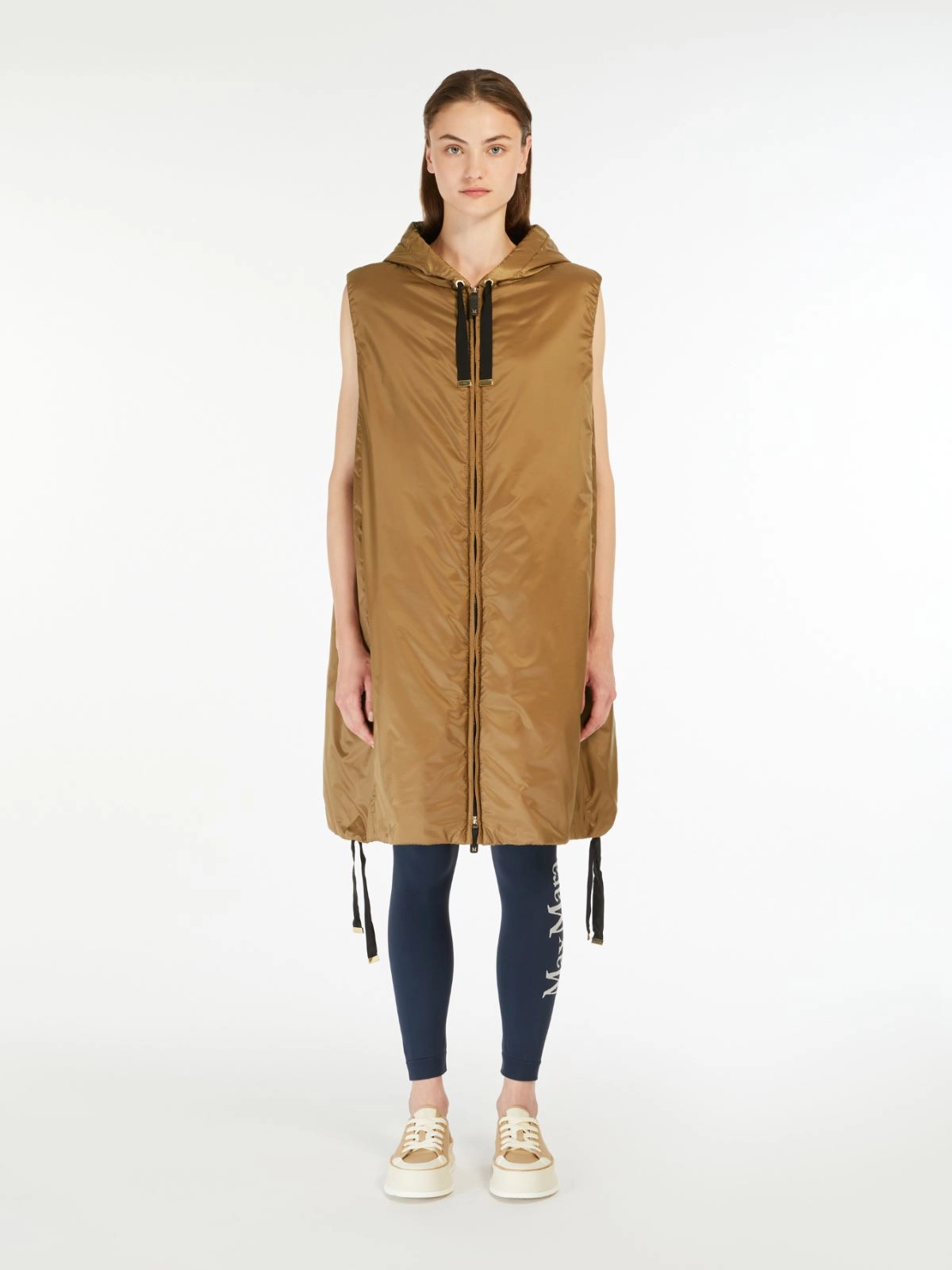 Midi gilet with hood and drawstring hem.