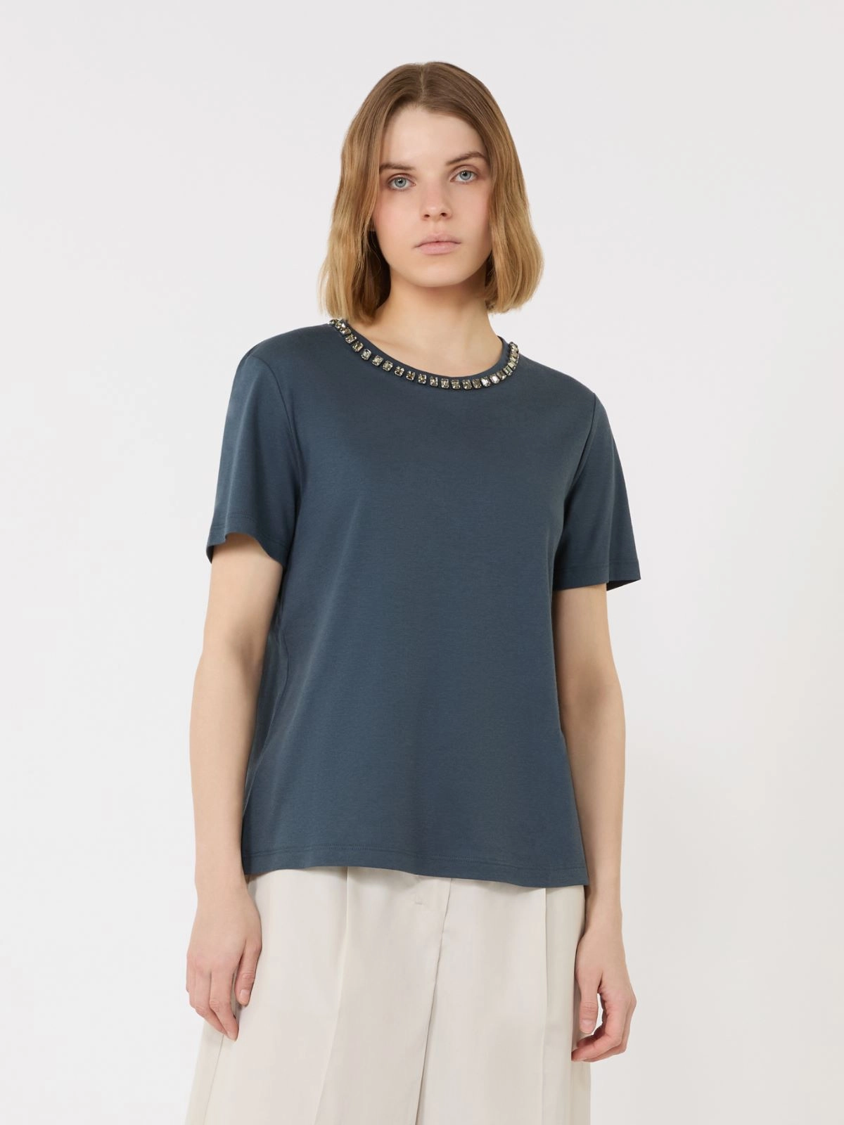 Basic T-shirt featuring bejewelled chaton embroidery on the neckline.
